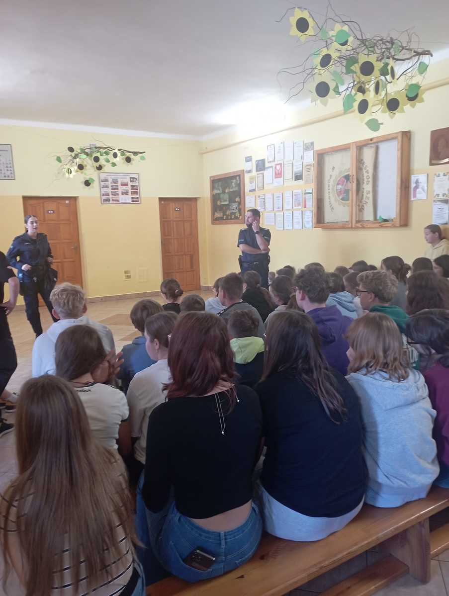 Dodatkowo mundurowi przeprowadzili rozmowy z uczniami starszych klas. Z młodzieżą poruszali tematy dotyczące zagrożeń, uzależnień, bezpieczeństwa w cyberprzestrzeni oraz odpowiedzialności za zachowania niezgodne z prawem.