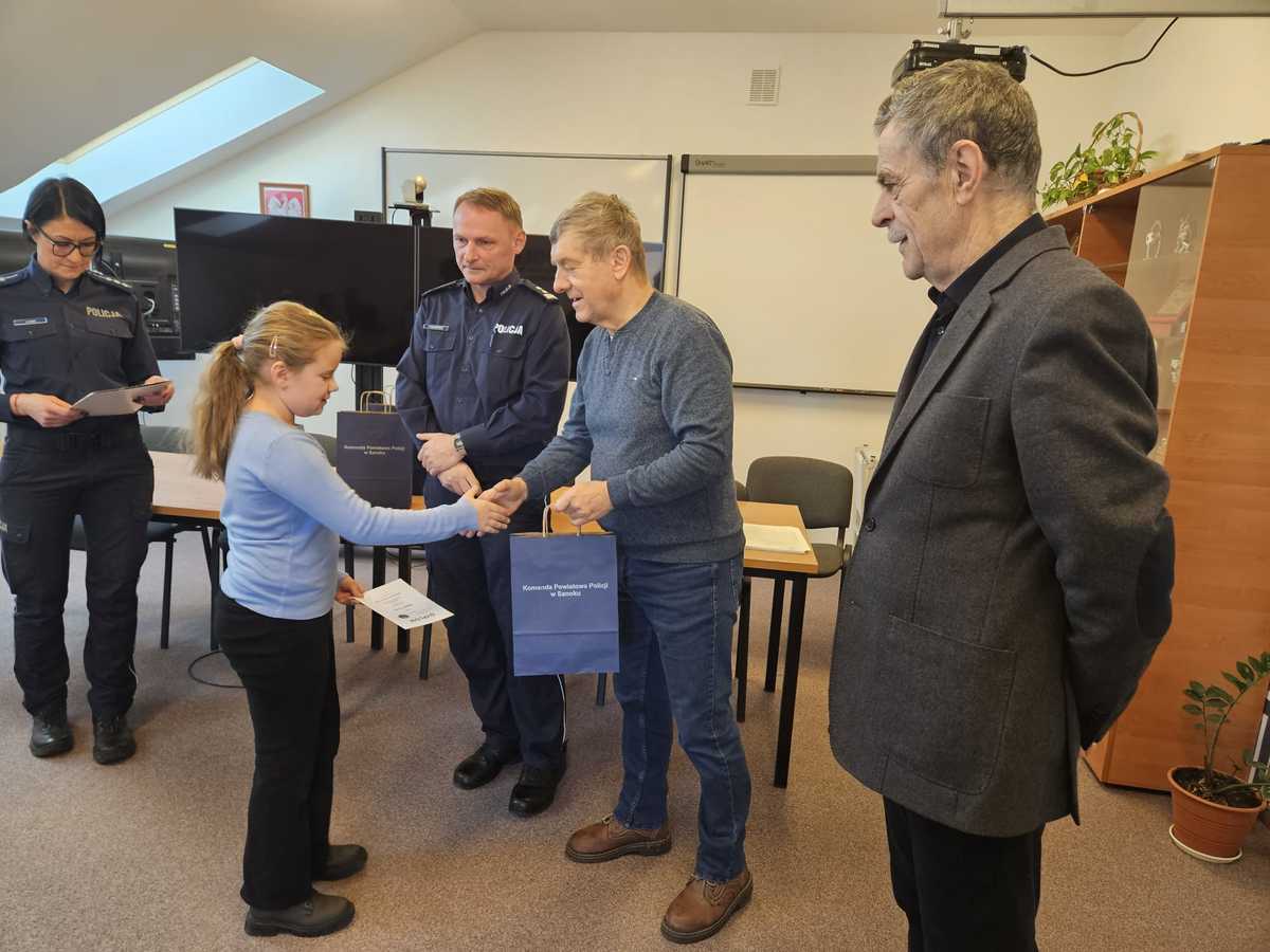 Wczoraj w świetlicy komendy nastąpiło wręczenie nagród laureatom konkursu plastycznego „Bezpieczne Wakacje 2025”. Młodym artystom gratulacje składali i wręczali nagrody I Zastępca Komendanta Powiatowego Policji w Sanoku mł. insp. Daniel Walankiewicz oraz Janusz Pleśnar i Andrzej Krawczyk – przedstawiciele IPA w Sanoku Region Bieszczady.
