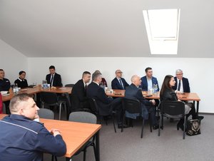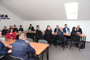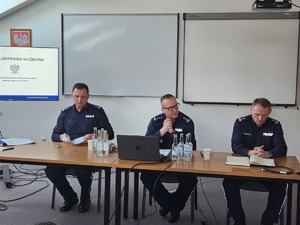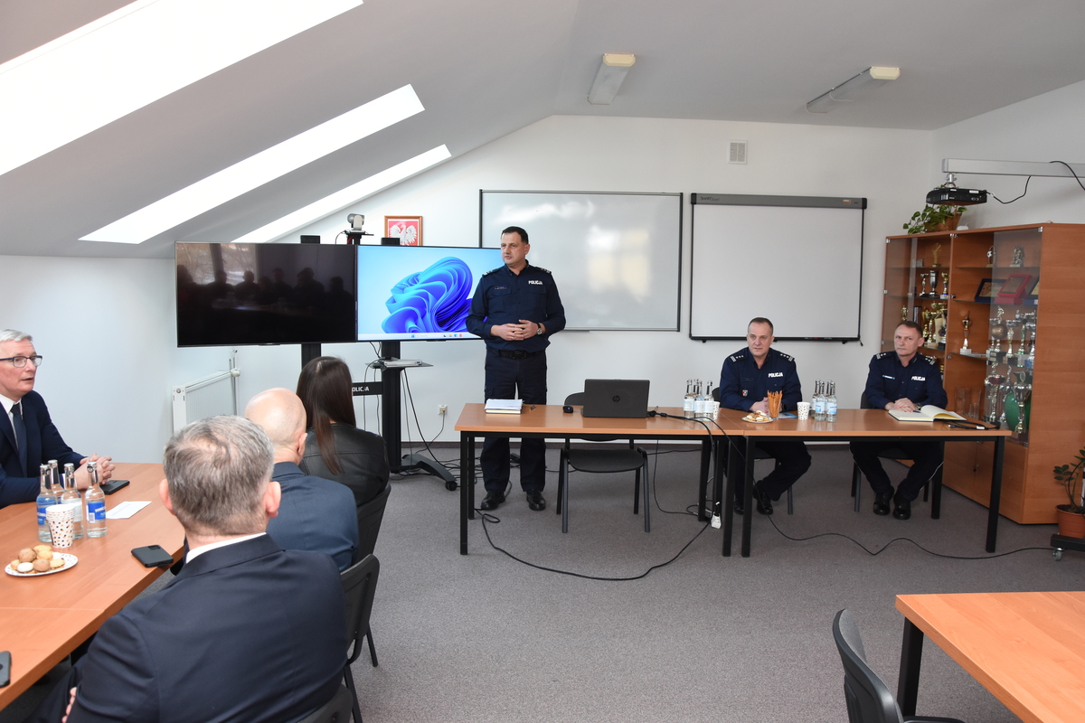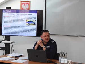 Następnie głos zabrał Zastępca Komendanta Wojewódzkiego Policji w Rzeszowie insp. Jacek Juwa. Komendant Wojewódzki posiłkując się prezentacją omówił pracę podkarpackich policjantów oraz opowiedział o zerealizowanych i zaplanowanych dalszych inwestycjach, miedzy innymi zakupionym sprzęcie, wyposażeniu, remontach. Komendant odniósł się również do pracy sanockich policjantów. Zwrócił uwagę na osiągniete wyniki i bardzo dobrą współpracę sanockiej policji z samorządami na rzecz bezpieczeństwa.