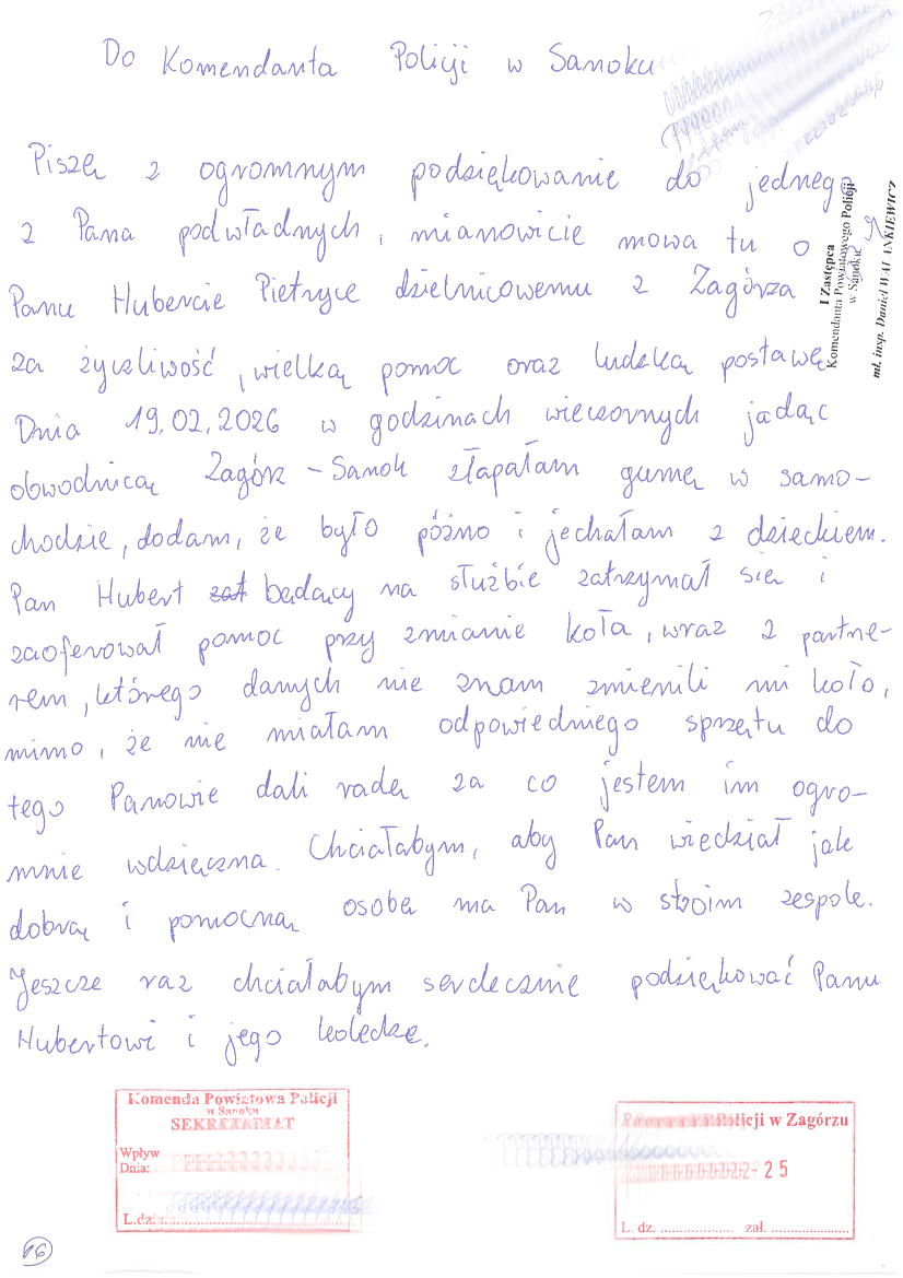 Na ręce Komendanta Powiatowego Policji w Sanoku mł. insp. Artura Kowalika, wpłynęło podziękowanie dla funkcjonariuszy, którzy pomogli przy wymianie uszkodzonego koła. List napisała kobieta, której samochód uległ awarii. Mundurowi pomogli w usunięciu usterki, co pozwoliło jej bezpiecznie dotrzeć do domu. Podziękowania od osób potrzebujących pomocy są dla policjantów najwyższym wyrazem uznania dla ich codziennego trudu.