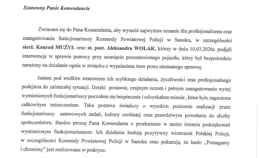 "Zwracam się do Pana Komendanta, aby wyrazić najwyższe uznanie dla profesjonalizmu oraz zaangażowania funkcjonariuszy..." to słowa, którymi rozpoczyna się list, jaki wpłynął do sanockiej komendy. Mężczyzna podziękował policjantom za uchronienie jego samochodu przed pożarem. Sytuacje, w których ludzie wyrażają wdzięczność, są dla policjantów największą i najbardziej satysfakcjonującą nagrodą.